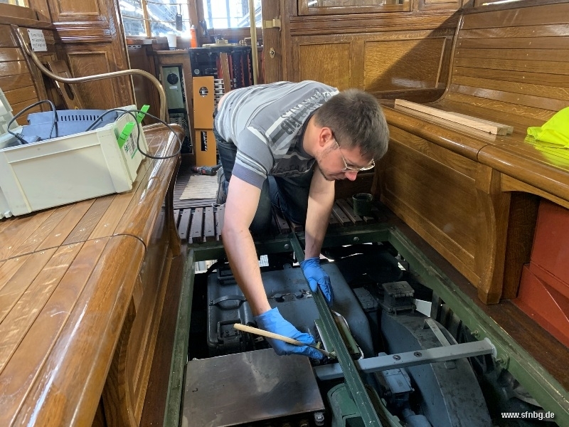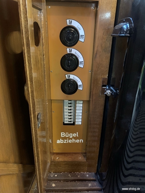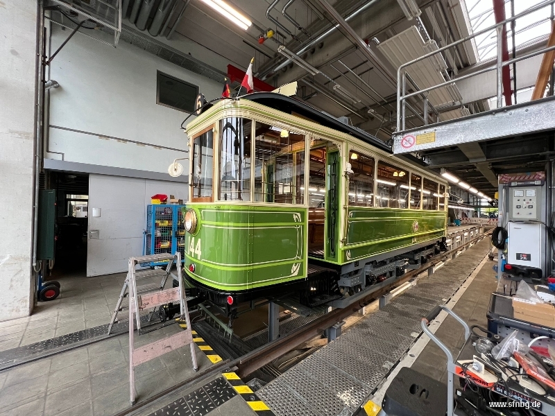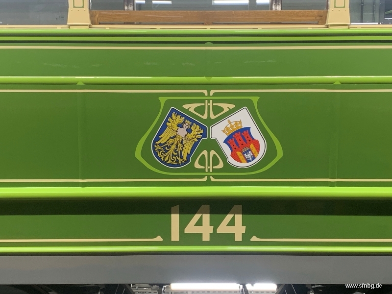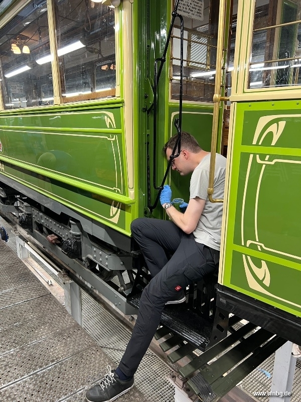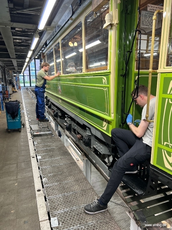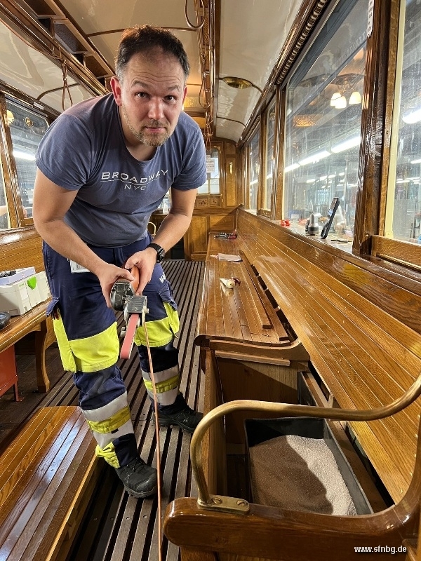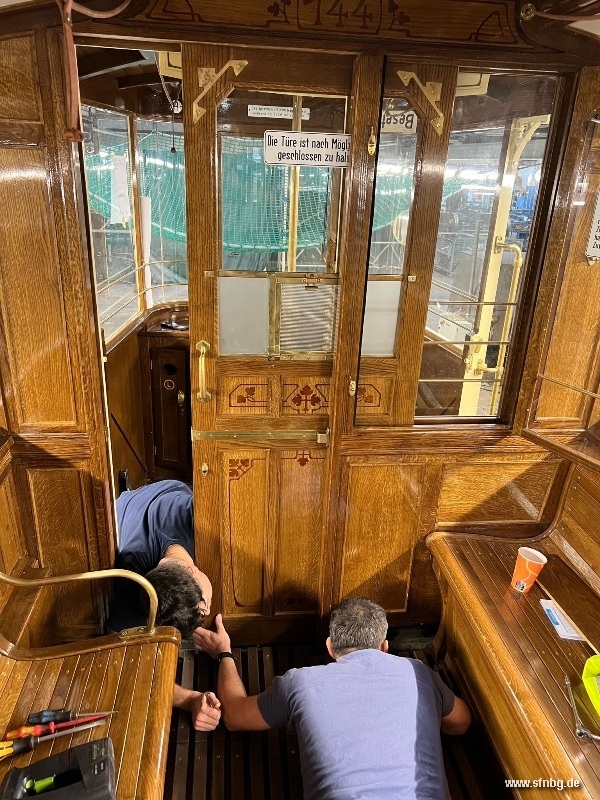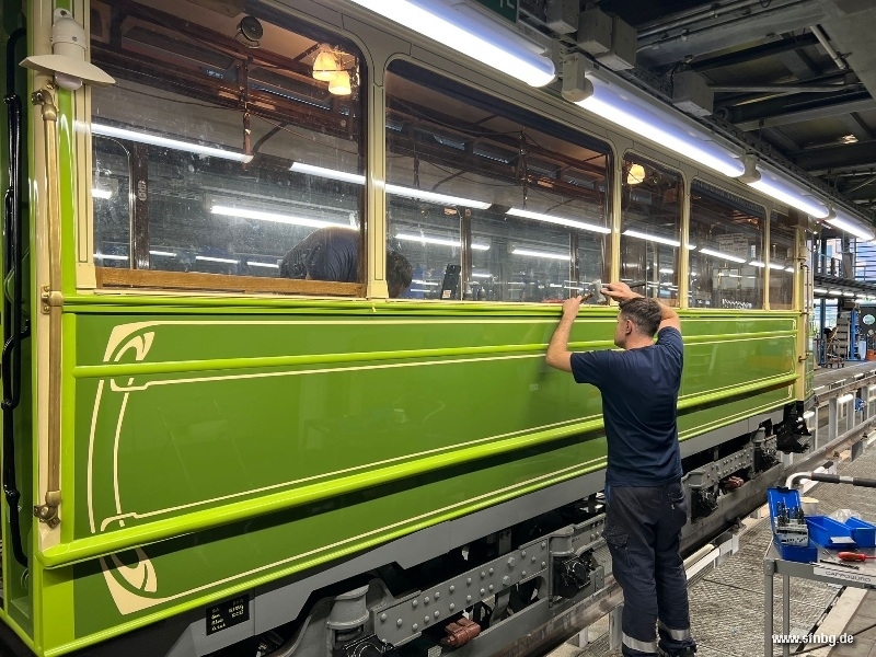 Die abschließenden Arbeiten am Zeppelinwagen laufen auf Hochtouren: zwischenzeitlich sind die Restarbeiten auf dem Dach abgeschlossen. Auch im Wageninneren ist der Wagen - abgesehen von den Zierlinien an der Decke und der Verkleidung der Sandkästen - fertig. Großen Aufwand erzeugt gerade noch der Einbau der Fußglocke, die aufgrund der beengten Verhältnisse unter der Plattform mit einer aufwändigen Mechanik bedient wird. Ebenfalls auf dem Programm stehen noch Verbesserungen der Handbremse, bis der Zeppelinwagen am 01./02. November 2025 vom Historischen Straßenbahndepot St. Peter aus erstmals zu öffentlichen Fahrten aufbrechen kann.