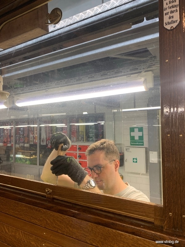 Noch das ganze Wochenende hindurch hat unsere Vereins-Werkstattgruppe am Zeppelinwagen gearbeitet, um ihm den letzten Schliff zu geben. Am Sonntagabend war dann der "Wagenausgang" - so nennt man in der Werkstattsprache, wenn ein Wagen fertig wird, seine letzte Abnahmefahrt hat und wieder in Betrieb geht. Insgesamt 8200 ehrenamtliche Arbeitsstunden liegen nun hinter uns, gut 700 davon für die abschließenden Arbeiten in Nürnberg.